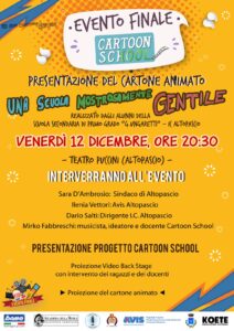Venerdì 13 Dicembre alle ore 20:30, presso il teatro-cinema “Puccini” di Altopascio, si svolgerà la presentazione del cartone animato “UNA SCUOLA MOSTROSAMENTE GENTILE”, realizzato dagli alunni delle classi 1A e 1D della scuola secondaria grazie al supporto dell’AVIS – donatori sangue di Altopascio e grazie alla professionalità di importanti operatori del settore disegno e animazione.